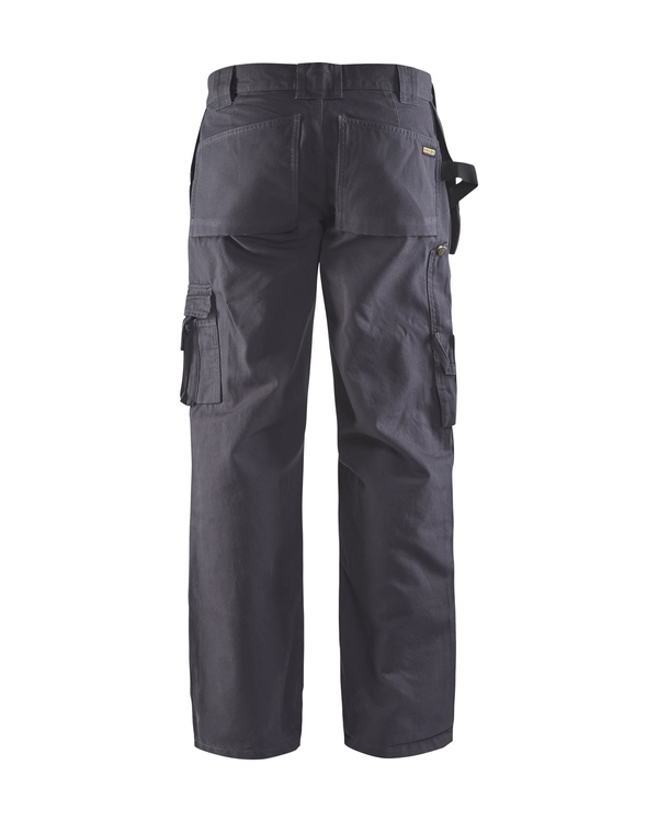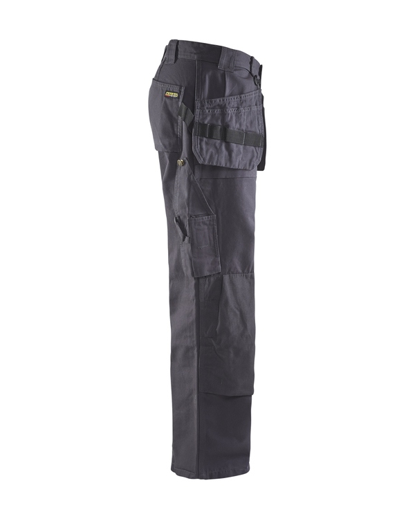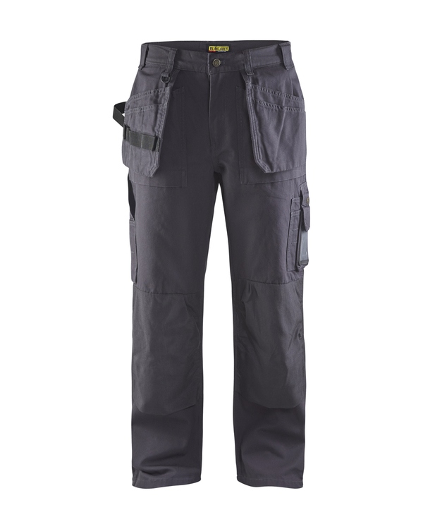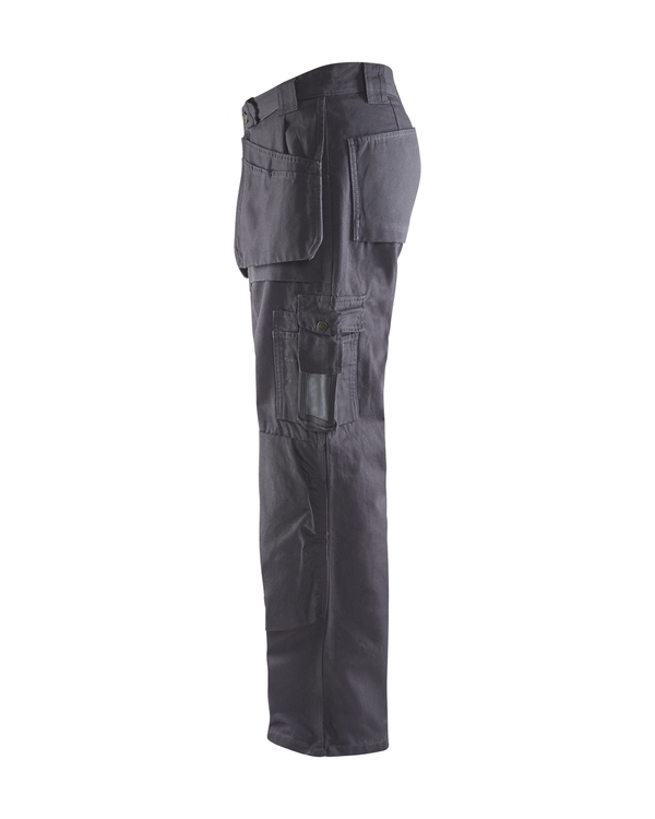Zwei lose, mit Cordura verstärkte Nageltaschen, die in die Vordertaschen mit Balg verstaut werden können. Zwei Gesäßtaschen mit Balg. Hammerschlaufe. Hosenschlitz mit solidem Reißverschluss aus Metall und Patentknopf. Kniepolstertaschen aus CORDURA®. Verstärkte Zollstocktasche mit Bleistifttasche und Messerbefestigung. Beintasche mit Bleistifttasche und zusätzlicher Tasche. Handytasche. ID-Ausweistasche.