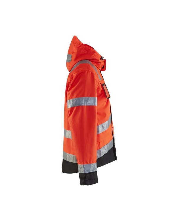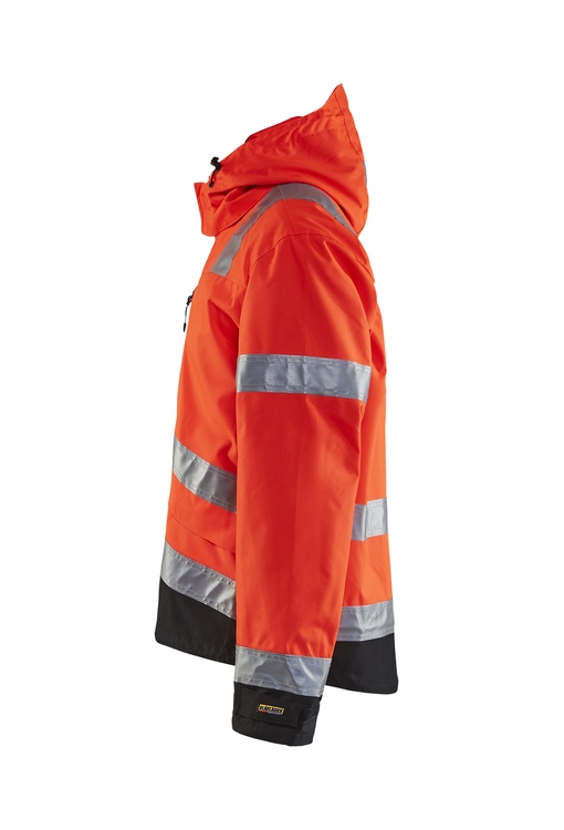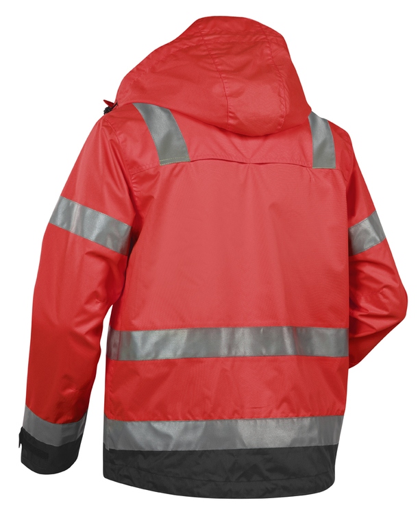 Wind- und wasserabweisendes Aussenmaterial. Vordertaschen mit wasserdichtem Reißverschluss. Atmungsaktiv. Zwei Brusttaschen mit wasserfestem Reißverschluss. Zwei verdeckte Fronttaschen. Justierbares Taillenband und Ärmelbündchen. Abnehmbare Kapuze. Mit Netz-Innenfutter. Innentasche und Handytasche. Ausweistasche. Leuchtfarben, 50 mm breite Reflexband. EN 471 / EN 20471 XS-S Klasse 2, M-5XL Klasse 3.