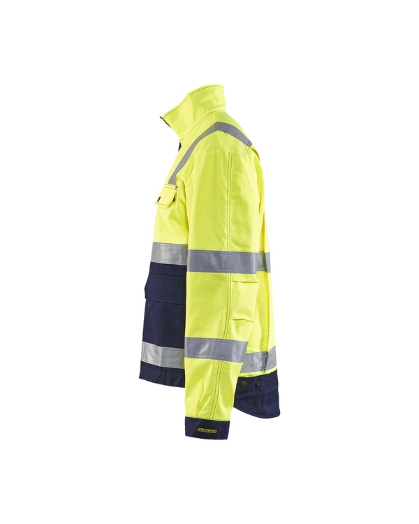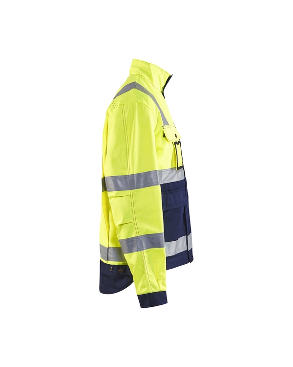 Zwei Brusttaschen mit Patte. Zwei Vordertaschen. Bewegungsfalte im Rücken. Verstellbare Ärmelbündchen. 50 mm breite Reflektoren. Handytasche. Schlüsselring. Ausweistasche. EN 471 XS-S Klasse 2, M-3XL Klasse 3.