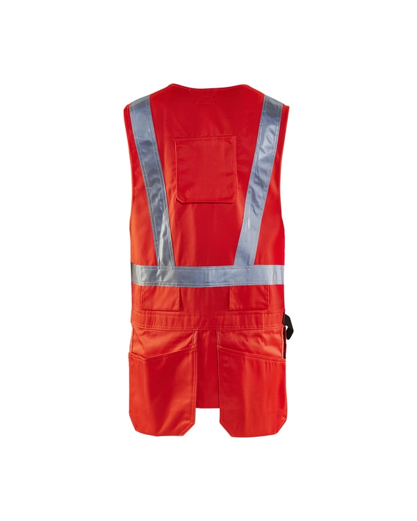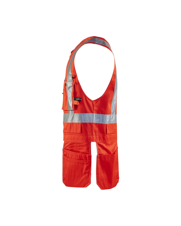 Zwei lose Brusttaschen mit Safety-Straps, eine mit Handytasche, die andere mit Messerhalterung. Vier verstärkte Nageltaschen vorne und hinten. Verlängerter Rücken. Öffnung im Rücken für die Verbindung mit optionalen Sicherheitsgurt. 50 mm breite Reflektoren. EN471 Klasse 2. Ausweistasche.