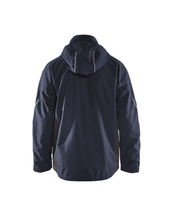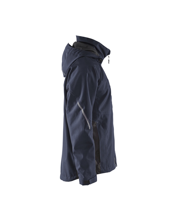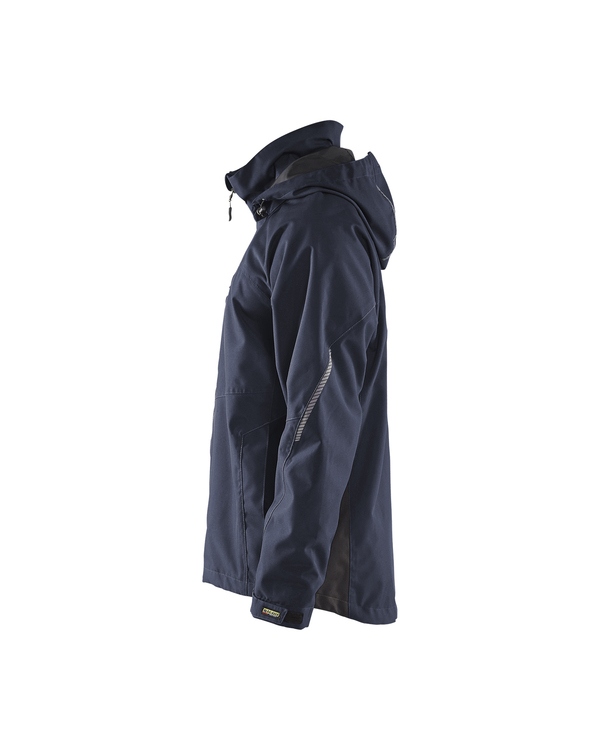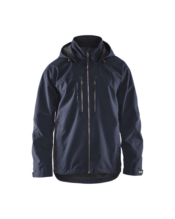 Atmungsaktive, wind- und wasserdichte Jacke, mit getapten Nähten, Seiten- und Brusttaschen mit Reißverschuss, Meshfutter, Innentasche mit integrierter Durchführung und Kabelführung für Headset, Ärmelbund aus Powershell-Material mit Daumenschlaufe, verstellbare und abnehmbare Kapuze, verdeckter, innenliegender Reißverschluss in unterem Rückenbereich für einfachen Zugang um Veredelung vorzunehmen, Verlängerter Rücken. Einstellbarer Bund mit Kordelzug, Reflektierende Details an den Ärmeln und an der Kapuze. EN343 Klasse 3.1.