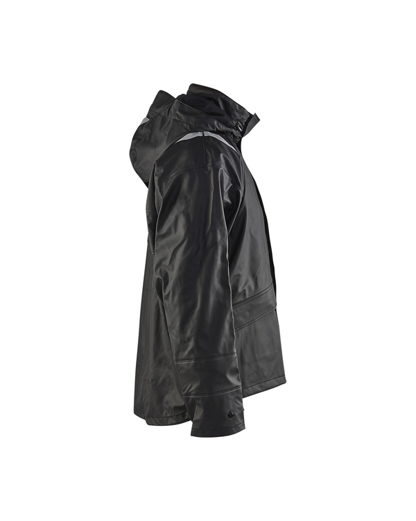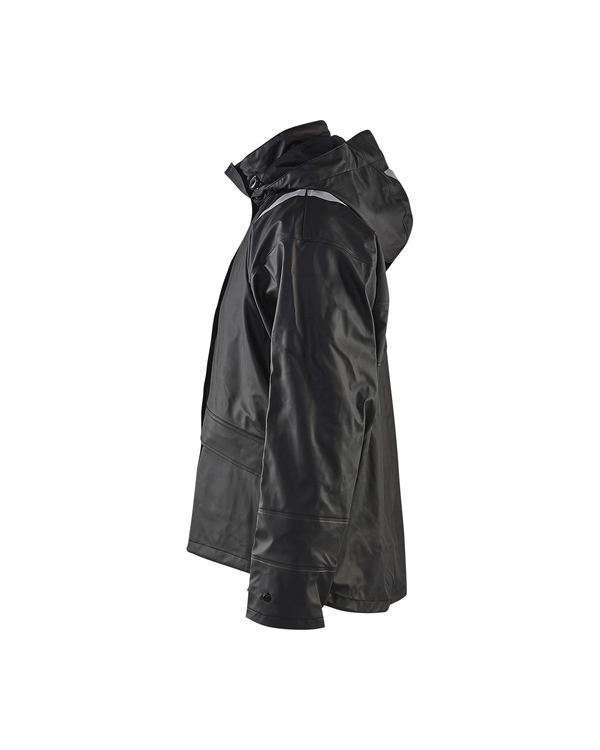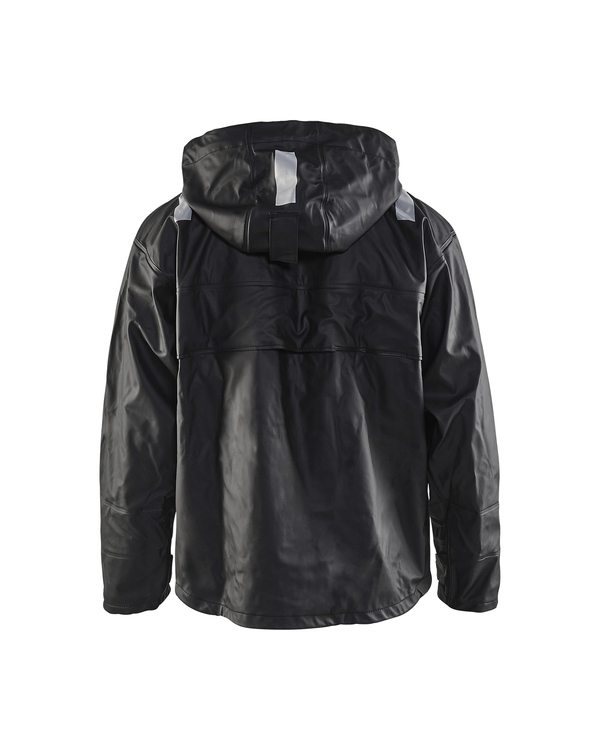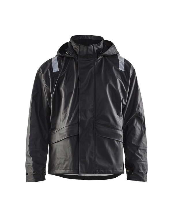 Verdeckter Zwei-Wege-Reißverschluss. Kordelzug mit Stoppern. Belüftung am Kragen. Verstellbare Ärmelbündchen. Zwei Brusttaschen mit Reißverschluss. D-Ring, rechts mit Ausweistasche, Napoleontasche mit Reißverschluss. Verstell- und abnehmbare Kapuze mit Klettverschluss für hohe Anpassung. Reflektoren an Brust, Schulter und Rücken. EN 343, Klasse 1. Zertifiziert nach EN343 class 3,1, Schutz gegen schlechtem Wetter. Farben 3300 und 5300 sind zertifiziert nach EN 20471, Klasse 3.