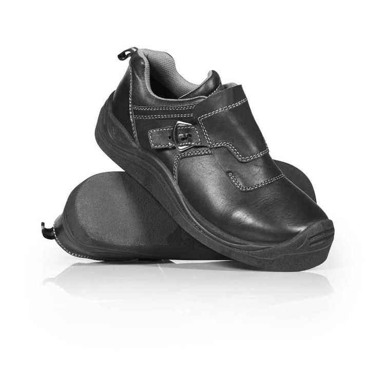 Schuhweite 11. Stahlkappe. Schaft aus hochwertigem Rindsleder mit komfortablem Schnallenverschluss. Gepolsterte, angenähte Staublasche. Rutschhemmende profillose Gummisohle mit idealer Stoßdämpfung, antistatisch, öl- und säurebeständig. Hitzebeständig bis 300 Grad. Perfekt geeingnet für das Arbeiten auf heißem Asphalt. Atmungsaktives Netzinnenfutter. Sicherheitsklasse S2 HRO SRA.