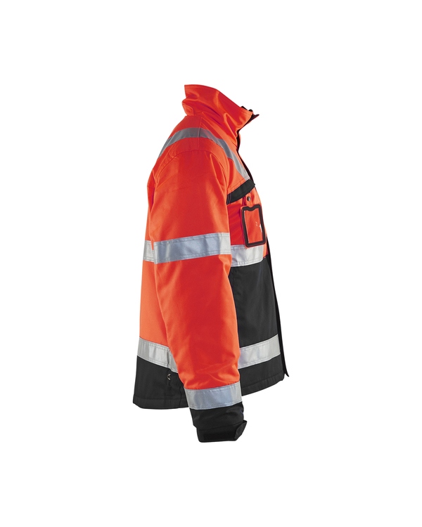 Wasser- und schmutzabweisendes Obermaterial. Zwei Front- und eine Brusttasche, mit Reißverschlüssen. Stiftetasche. Einziehbare Ausweistasche. Verstellbare Bündchen und Saum. Eine Innentasche. 50 mm breite Reflexstreifen. Zertfiziert nach EN 471, Warnschutzkleidung. S-L Klasse 2, XL-4XL Klasse 3, EN 342 zertifiziert, Schutz gegen Kälte.