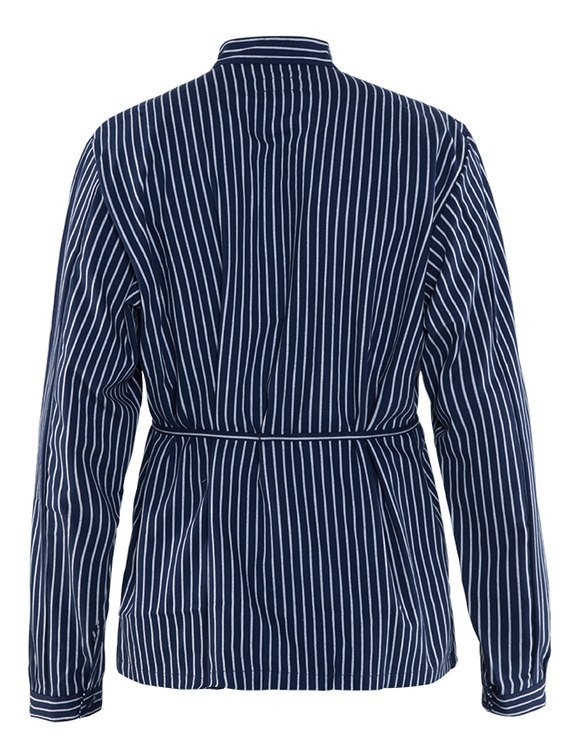 Chinakragen. Lange Ärmel mit schmalen Bündchen. Brusttasche. Bindegürtel.