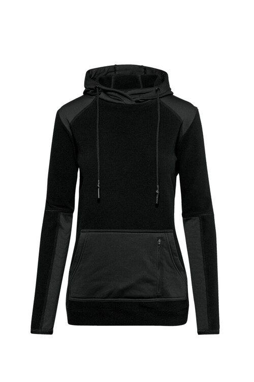 Funktionelles, sportlich geschnittenes Kapuzen-Stretchfleece für Damen, mit Kängurutasche mit einer eingearbeiteten Tasche mit Click-down-Reißverschluss von YKK®. Kapuze mit Kordel, das Kordelende ist mit Gummierung. Hochwertige Kunststoffösen mit HAKRO Schriftzug und elastischen Ärmelabschlüssen. Hergestellt aus angenehm dehnfähigem, hochwertigem 300er-Stretch-Microfleece mit LYCRA®, für exzellente Bewegungsfreiheit. Gewebtes HAKRO Necklabel aus hochwertigem Kettsatin mit weichen, ultraschallgeschnittenen Bandkanten für höchsten Tragekomfort und gewebtes HAKRO Flaglabel an der linken Seitennaht.