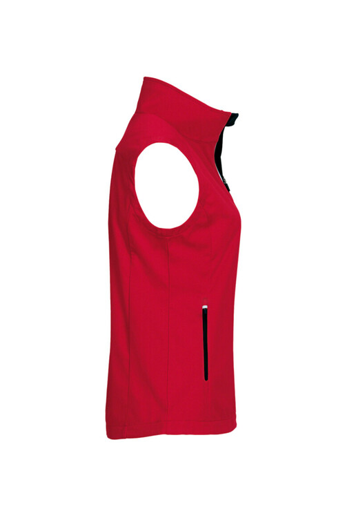 Leichte, atmungsaktive, strapazierfähige Softshellweste für Damen, mit wasser- und winddichtem Softshellobermaterial, Teilungsnähten auf Vorder- und Rückenteil für perfekte Passform, hochwertigem Zwei-Wege-Frontreißverschluss mit innenliegender Windstoppatte, Reißverschlussgarage und Reflexpaspel, seitlichen Reißverschlusstaschen mit Reflexapplikation und reflektierender Druckgrafik am verlängerten, abgerundeten Rückenteil, weitenverstellbarem Saumabschluss mit Tunnelkordelzug und Stoppern. Alle Click-down-Reißverschlüsse von YKK®. Hergestellt aus leichtem, dehnfähigem Softshellmaterial für exzellente Bewegungsfreiheit aus Interlock-2-Lagen-Laminat mit TRIACTIVE PRO-Technologie. Gedrucktes HAKRO Necklabel für höchsten Tragekomfort und gewebtes HAKRO Flaglabel an der linken Seitennaht.