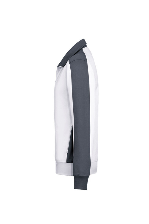 Besonders strapazierfähige Sweatjacke mit kontrastfarbigen Einsätzen an den Seiten, Schultern und Ärmeln, formstabilen Bündchen mit LYCRA®-Anteil, nicht angerauter Innenseite (French-Terry), Nackenband, hochwertigem Frontreißverschluss und seitlichen Einschubtaschen mit Reißverschluss. Alle Reißverschlüsse von YKK®. Leasingkoller zur einfachen Kennzeichnung in der gewerblichen Wäscherei und Aufhängebänder im Saum. Hergestellt aus weicher, besonders pflegeleichter und funktioneller Maschenware aus dem HAKRO Performance-Materialmix Mikralinar®. Gewebtes HAKRO Necklabel aus hochwertigem Kettsatin mit weichen, ultraschallgeschnittenen Bandkanten für höchsten Tragekomfort und gewebtes HAKRO Flaglabel an der linken Seitennaht.